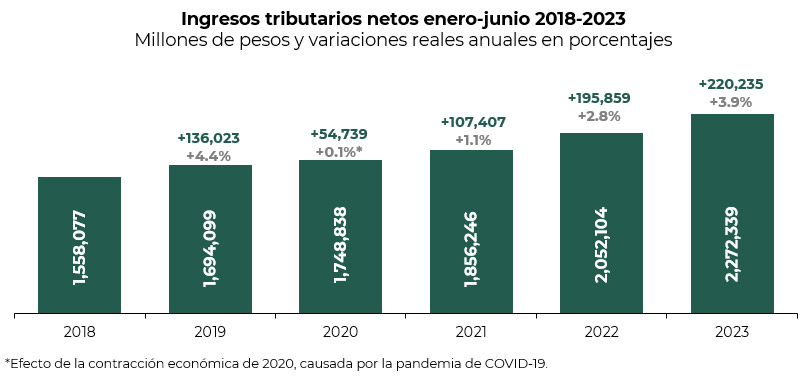 De este modo, de 2018 a 2023 el crecimiento real del ingreso tributario neto ha sido de 12.9%.
