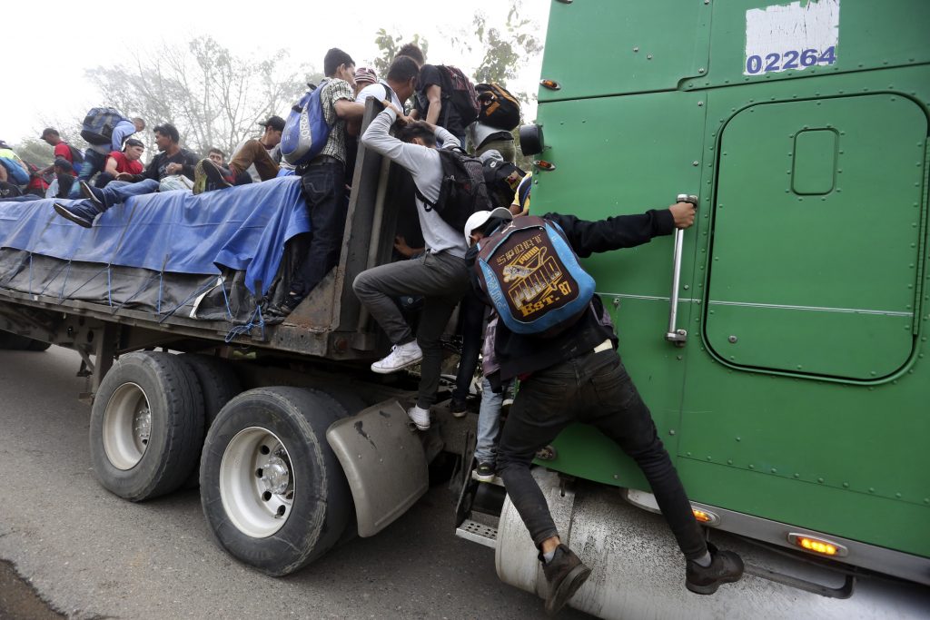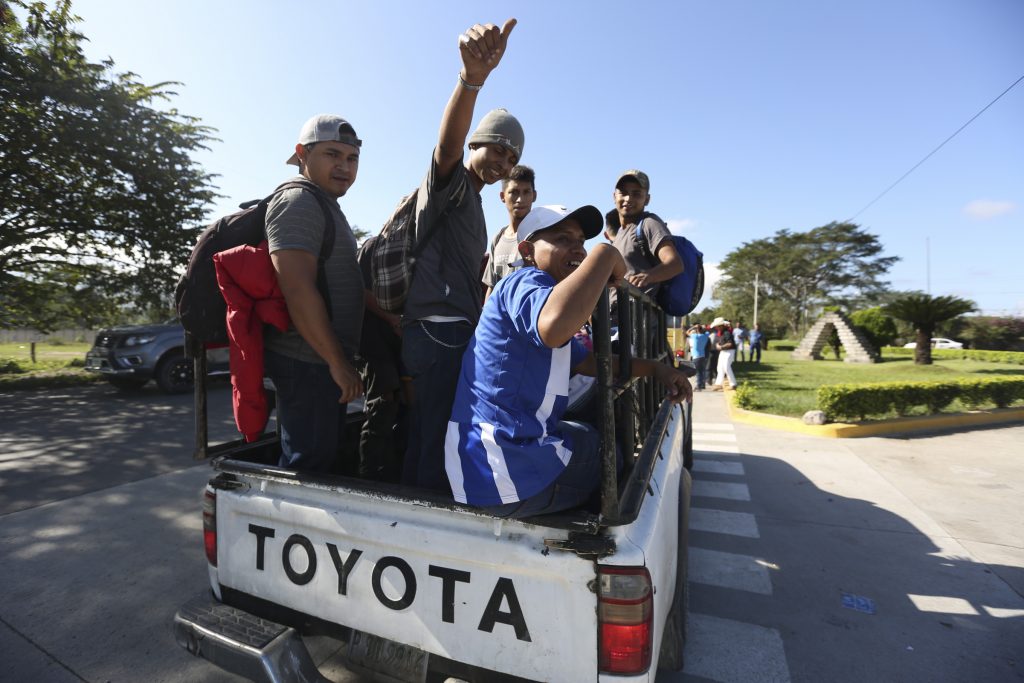San Pedro Sula.- Migrantes hondureños suben a un transporte de carga en la salida de la ciudad de San Pedro Sula, Honduras.
