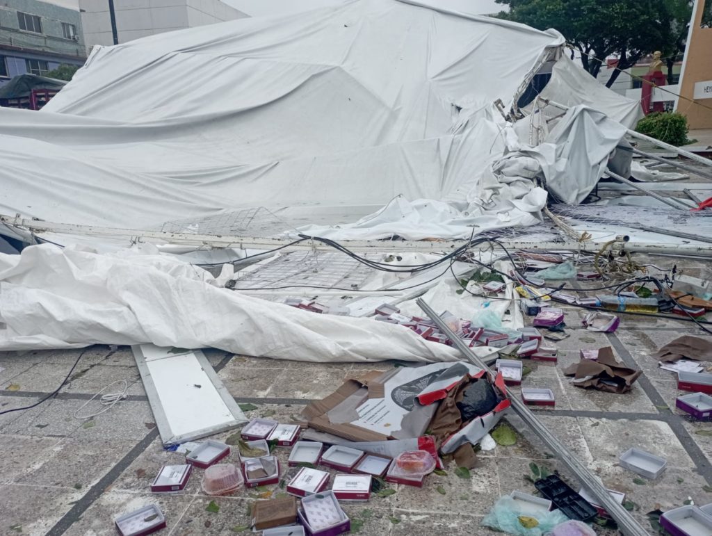 Se desplomó techo de exposición artesanal en Coatza; se dañó mucha mercancía