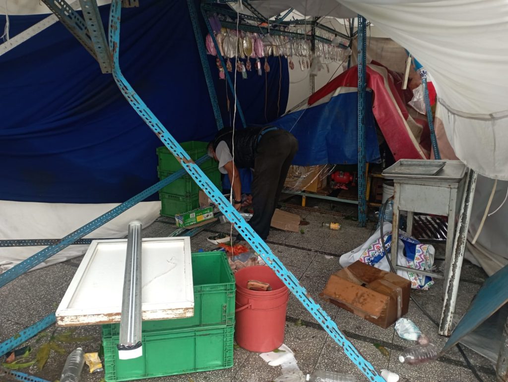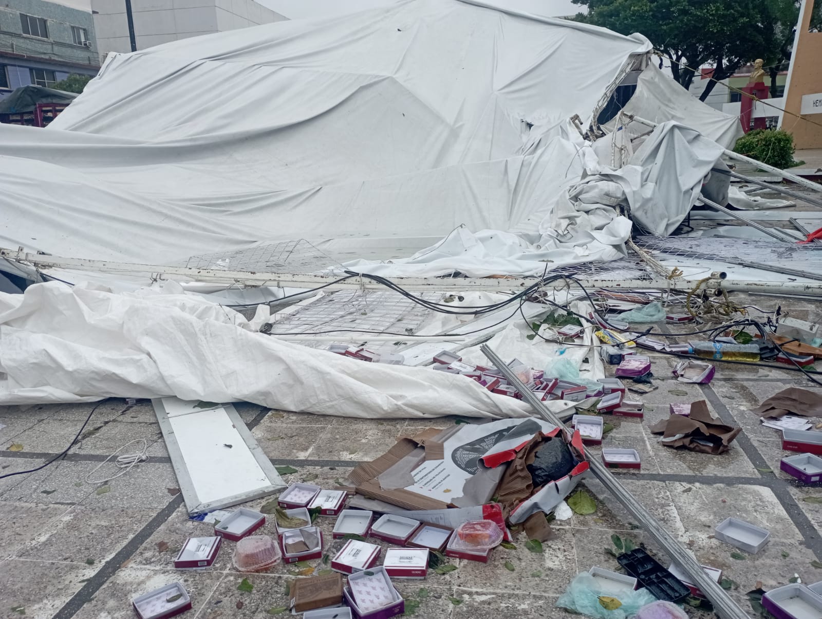 Los artesanos y emprendedores reportaron pérdidas materiales de consideración, ya que sus mercancías se vieron dañadas por la caída de los tubos metálicos, luego de que las cuerdas que sujetaban las carpas cedieran cayendo sobre los locales que se habían montado desde el pasado día sábado.