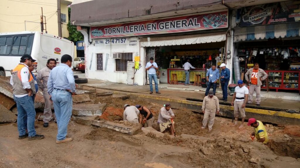 Coatzacoalcos, Ver.- Debido a la ruptura de una tubería de agua potable, aunado a las lluvias de las últimas horas, se formó un socavón sobre la avenida Zaragoza de Coatzacoalcos entre Malpica e Hidalgo.