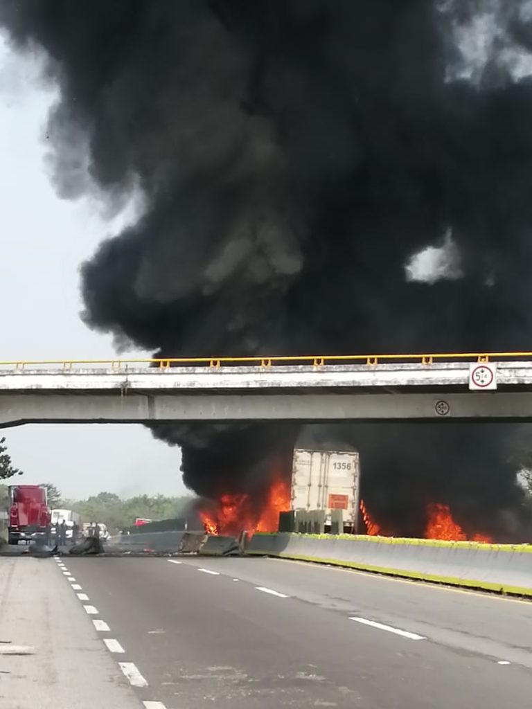 Coatzacoalcos, Ver.- Un tractocamión de caja seca que circulaba sobre la autopista Nuevo Teapa-Cosoleacaque fue consumido por el fuego, al impactar de manera abrupta contra el muro central; el hecho cobró la vida de un hombre.