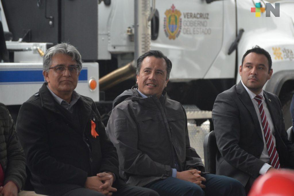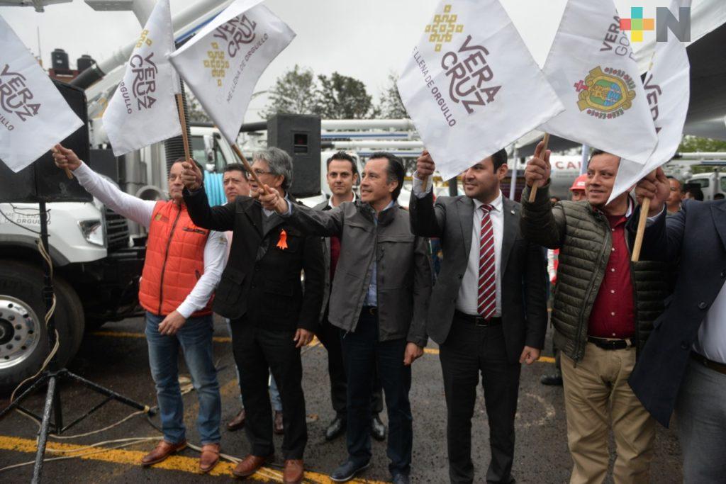 En el banderazo de salida de los primeros vehículos de desazolve, el Gobernador Cuitláhuac García Jiménez, dijo que se triplicará la capacidad de atención de la CAEV, se otorgará servicio rápido y eficiente a 95 municipios del estado donde se presta el servicio.