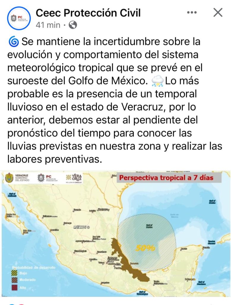 Xalapa, Ver.-  La Secretaría de Protección Civil del estado de Veracruz, dio a conocer a través de redes sociales que se mantiene la incertidumbre sobre la evolución y comportamiento del sistema meteorológico tropical que se prevé en el suroeste del Golfo de México.