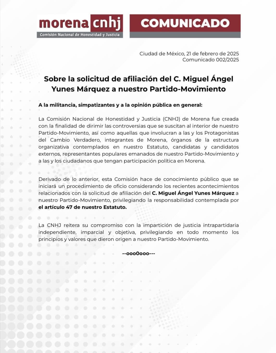 Tras la inconformidad general suscitada entre la militancia, incluida la firme y congruente postura de la gobernadora de Veracruz, Rocío Nahle García, la CNHJ de Movimiento Regeneración Nacional, emitió un comunicado donde anuncia que ante estas circunstancias inició un procedimiento de oficio a la solicitud de afiliación del C. Miguel Ángel Yunes Márquez con base en el artículo 47 de sus estatutos.