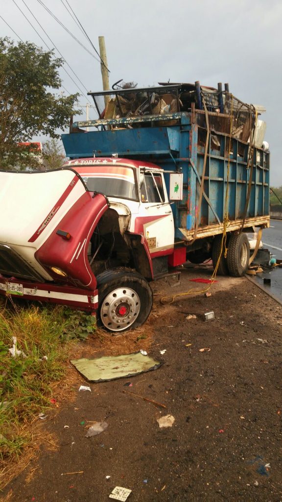 Xalapa, Ver., 11 de abril de 2017.-  La mañana de este martes se registró un accidente en la carretera federal kilómetro 43, en donde dos vehículos pesados, uno color blanco con placas de circulación 715-aj-2 de la Ciudad de México se impactó contra un torton blanco con azul placas xu-65-088.