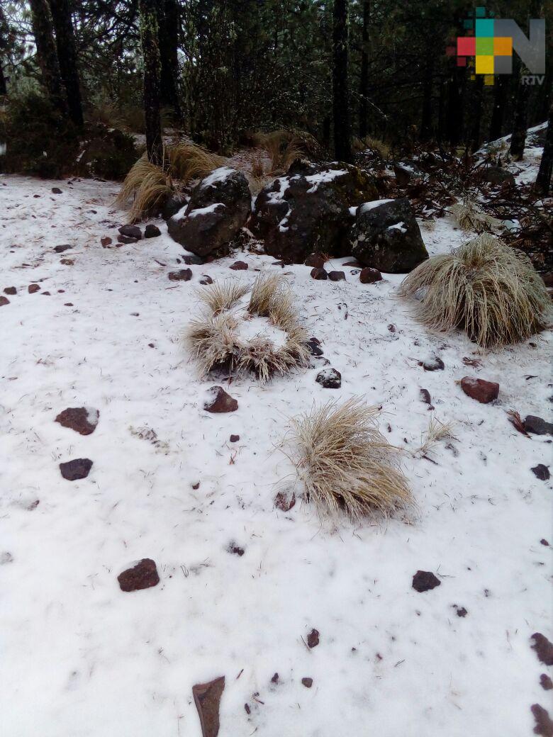 Perote, Ver.- En la parte más alta del Cofre de Perote los árboles cambiaron de tonalidad. El verdor del bosque se esfumó en un abrir y cerrar de ojos, prácticamente la montaña se pintó de blanco como resultado del paso del frente frío número 24.