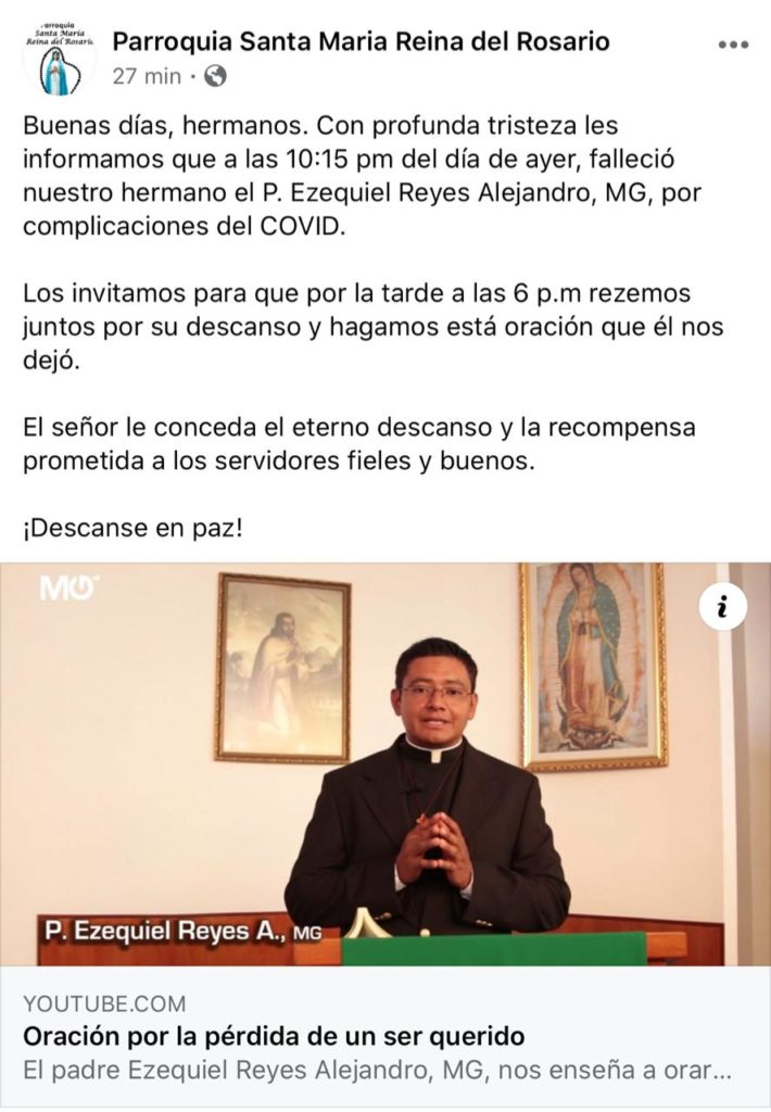 Incluso hace dos días celebró una de las misas virtuales que se han estado transmitiendo vía facebook por parte de la parroquia.
