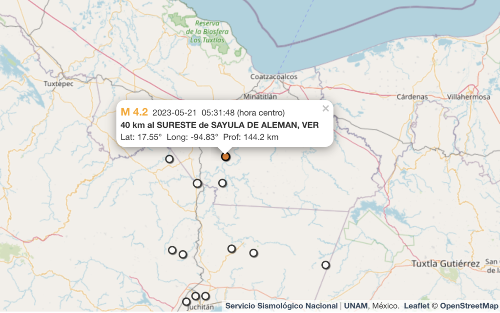 “SISMO Magnitud 4.2 Loc 40 km al SURESTE de SAYULA DE ALEMAN, VER 21/05/23 05:31:48 Lat 17.55 Lon -94.83 Pf 144 km”, esta fue la publicación hecha en redes sociales por parte del SSN.