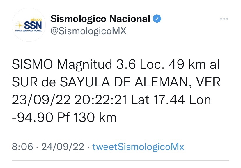 Xalapa, Ver.- Este sábado por la mañana se registró un sismo en Sayula de Aleman, Veracruz; la intensidad del fenómeno de la naturaleza fue de 3.6, así lo informó el Servicio Sismológico Nacional.