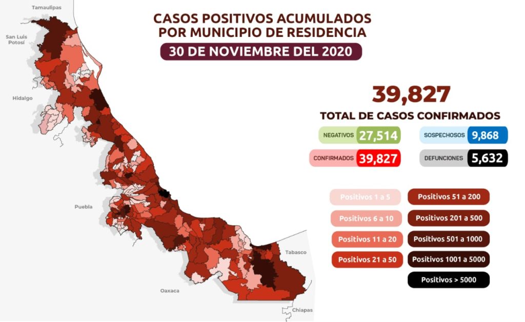 Xalapa, Ver.-Este lunes el número de casos positivos acumulados a COVID-19 en Veracruz es de 39 mil 827 en 207 municipios. De este total son ya 31 mil 824 las personas recuperadas que recibieron el alta en alguna unidad del Sector Salud y en observación 2 mil 371.