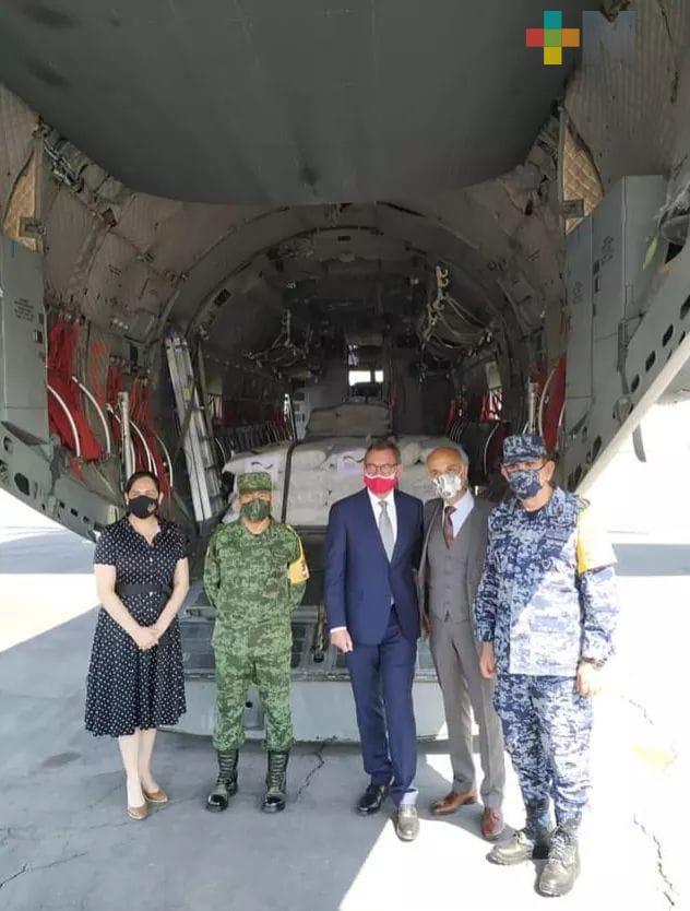 Villahermosa, Tabasco.- Al aeropuerto Internacional de Villahermosa arribó un avión de Fuerza Aérea Mexicana transportando 7 de 50 toneladas de ayuda humanitaria donadas por Alemania gracias a la gestión del Embajador Peter Tempel y atención del Canciller Marcelo Ebrad.
