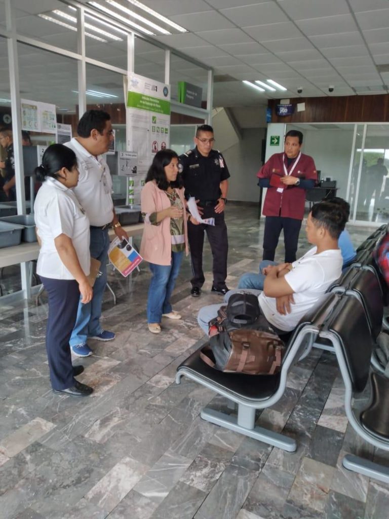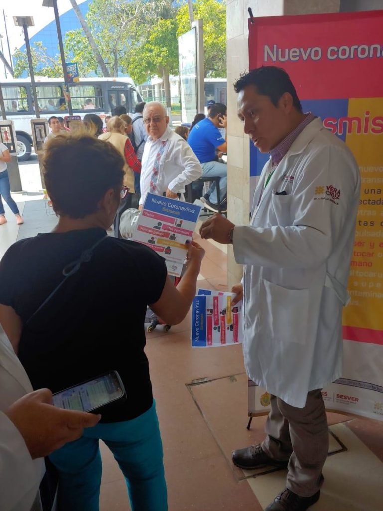 Xalapa, Ver.- La Secretaría de Salud (SS), a través de la Dirección de Protección contra Riesgos Sanitarios y los Departamentos de Regulación Sanitaria, informa sobre el coronavirus en aeropuertos, recintos portuarios, terminales de autobuses y establecimientos comerciales, colocando espectaculares y repartiendo material gráfico.