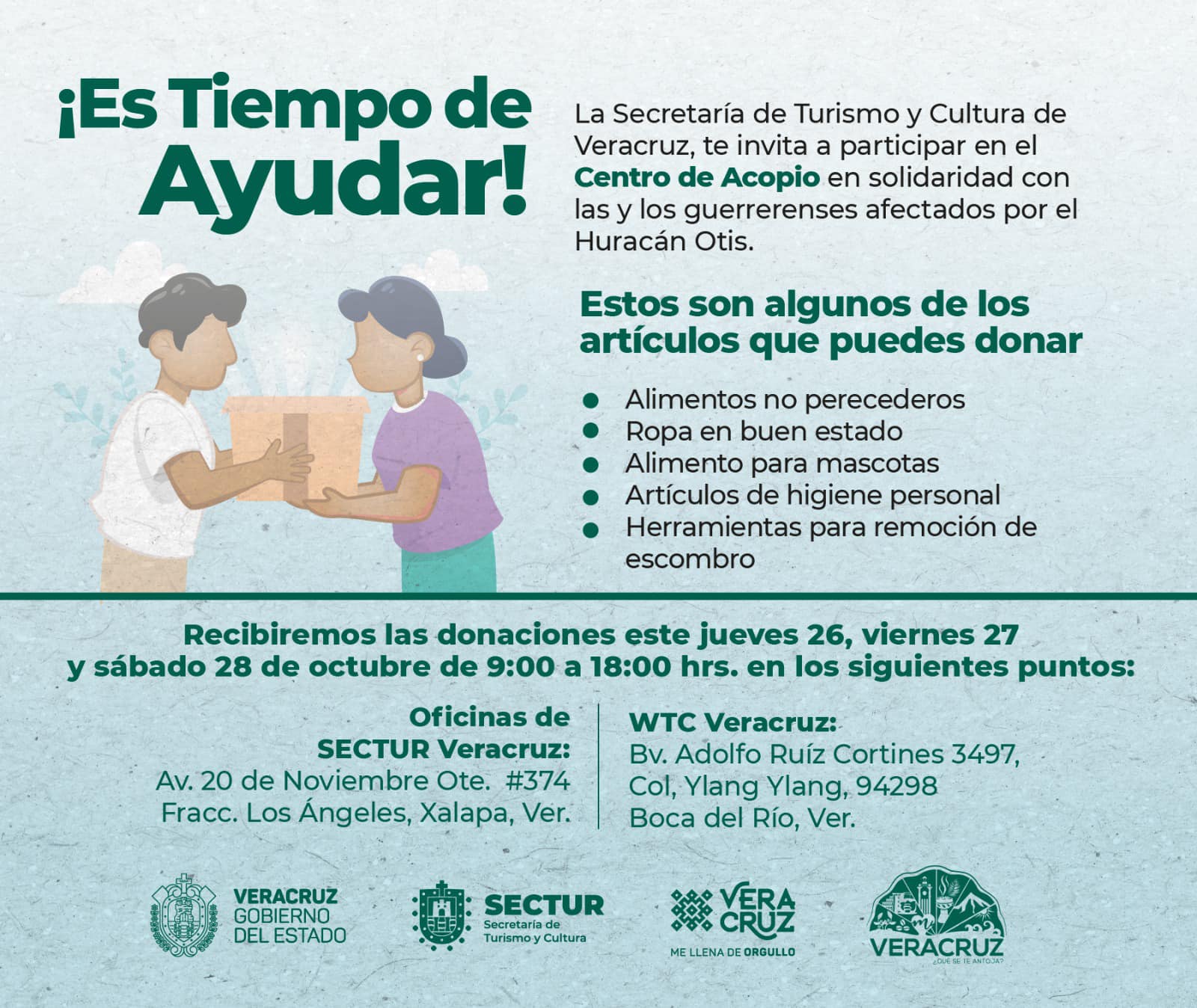 Xalapa, Ver.- La Secretaría de Turismo y Cultura invita a la ciudadanía veracruzana a apoyar en la donación de víveres y participar en el Centro de Acopio abierto en dos sedes, en solidaridad con los guerrerenses afectados por el paso del huracán Otis, en la región.