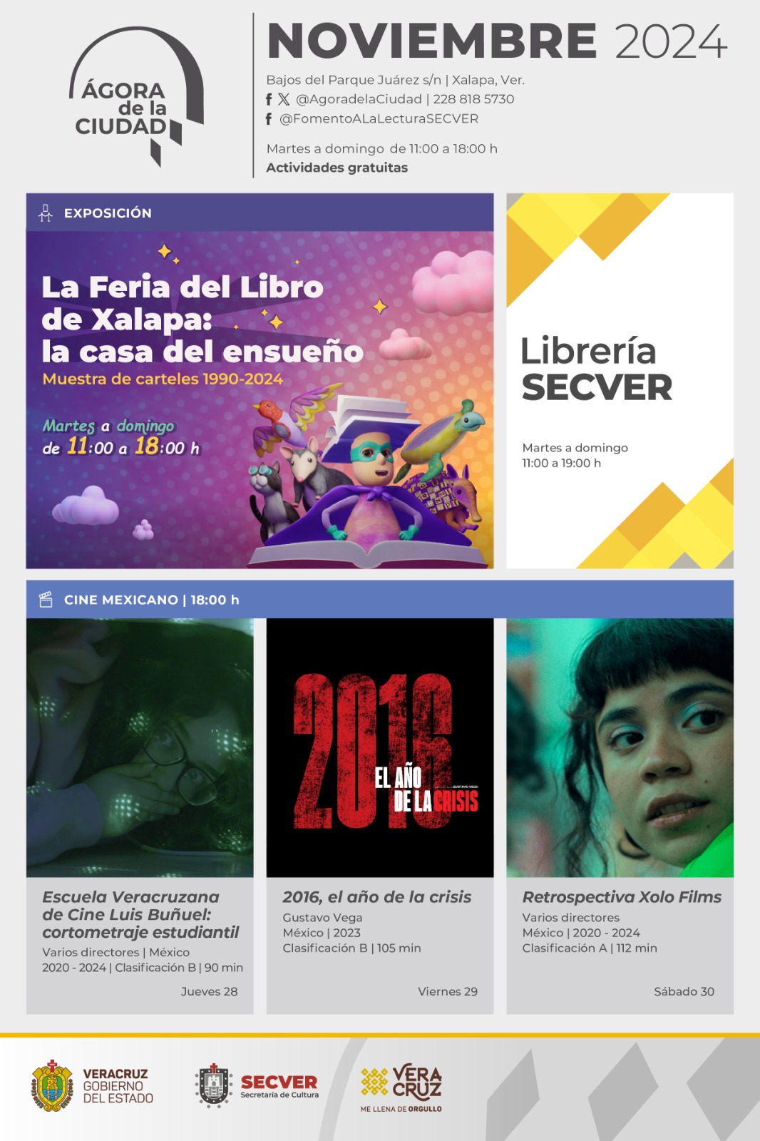 La Secver reitera la invitación a asistir a las funciones cinematográficas del programa Cine SECVER que tendrán lugar el jueves 28, viernes 29 y sábado 30 de noviembre en la Sala de proyecciones del Ágora de la Ciudad. Consulta la programación completa en la cuenta de Facebook @AgoradelaCiudad y conoce todas las actividades de la red de recintos de la Secretaría en el sitio web oficial www.culturaveracruz.gob.mx.