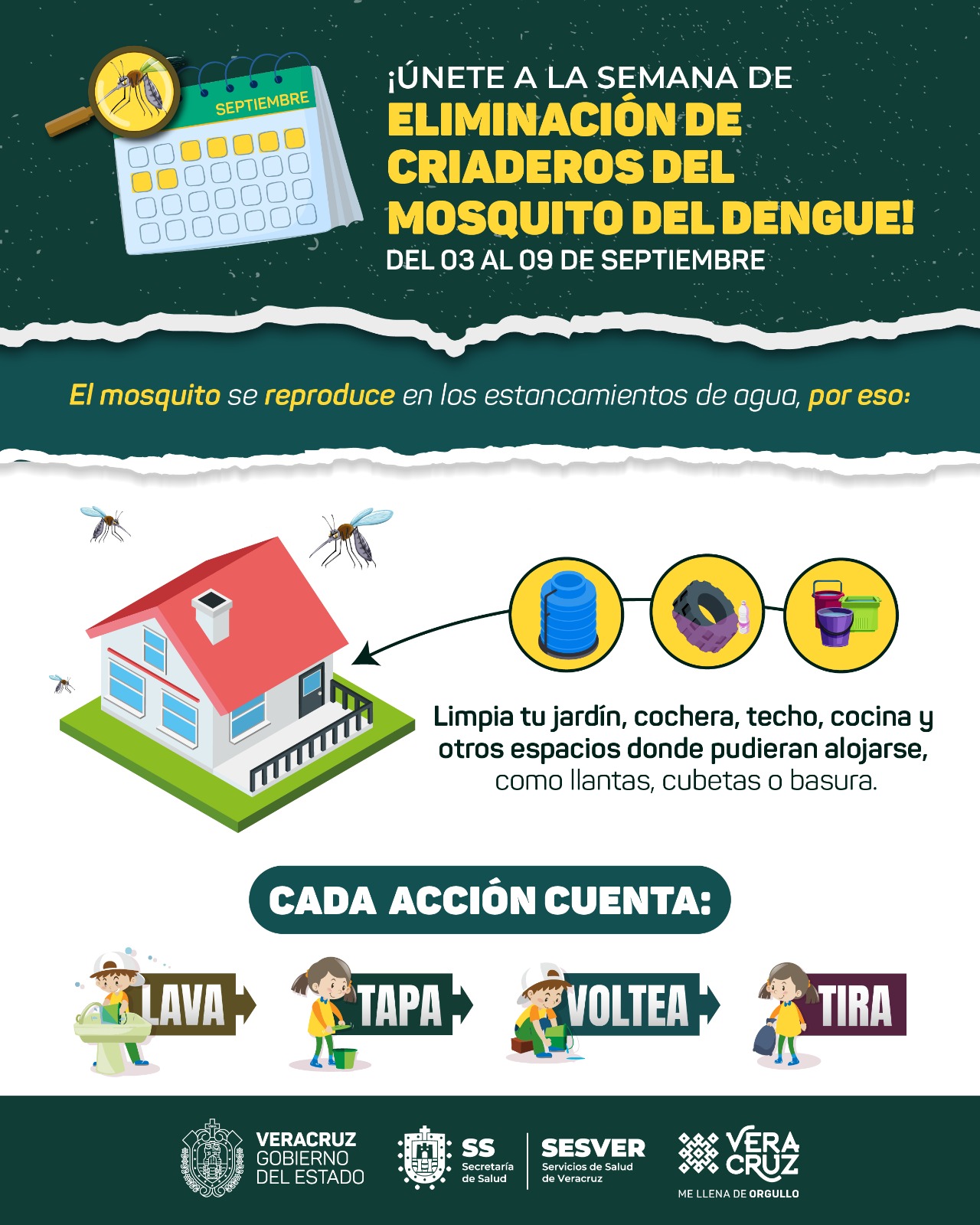 Redacción.- A través de sus redes sociales, la Secretaría de Medio Ambiente en el Estado invita a la ciudadanía a sumarse y participar en la Semana de Eliminación de Criaderos del Mosquito del Dengue.