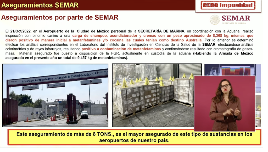 «Este aseguramiento de más de ocho toneladas que se encontraron en una carga en el Aeropuerto de la Ciudad de México es el mayor asegurado de este tipo de sustancias en los aeropuertos de nuestro país, lo cual confirma que hace una gran decisión haber puesto en manos de la Semar esta instalación estratégica”, señaló Mejía Berdeja.