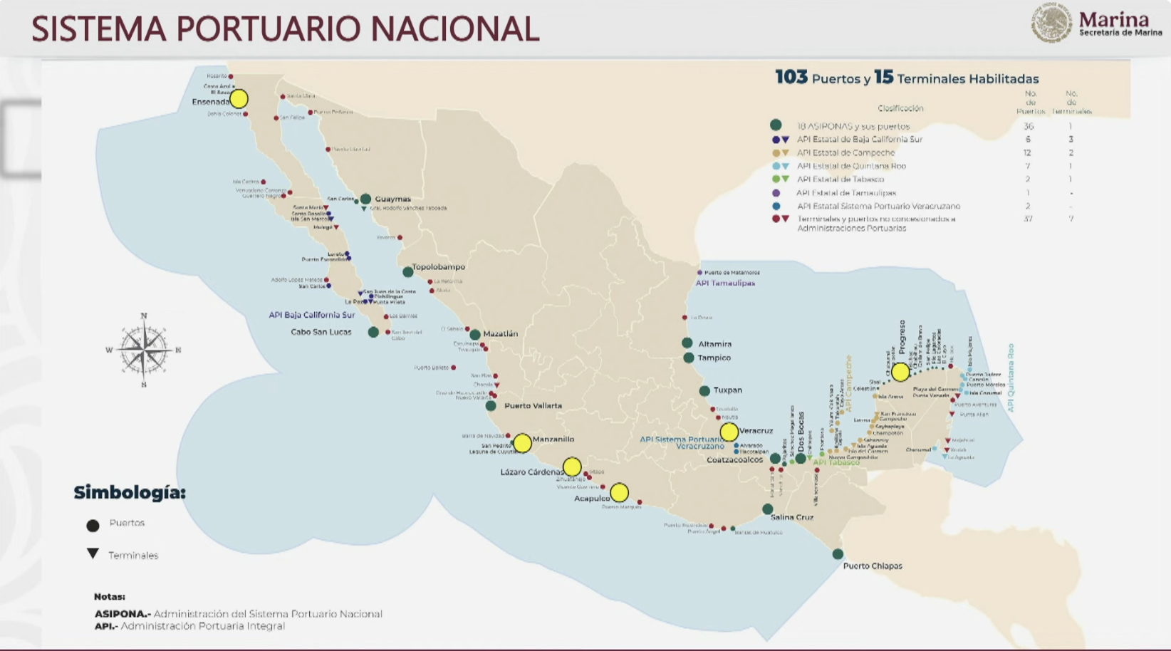 A nivel nacional, la Secretaría de Marina informó que los puertos que se intervendrán son: Ensenada, Manzanillo, Acapulco, Lázaro Cárdenas, Veracruz y Progreso.