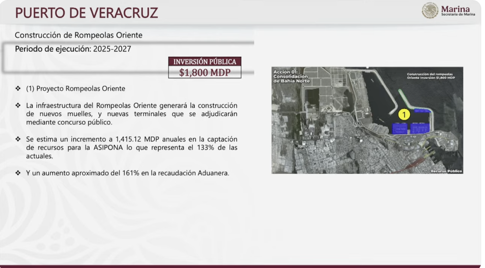 En la modernización del puerto de Veracruz se considera la construcción de un Rompeolas Oriente, cuyo periodo de ejecución será de 2025-2027 con una inversión pública de mil 800 millones de pesos.
