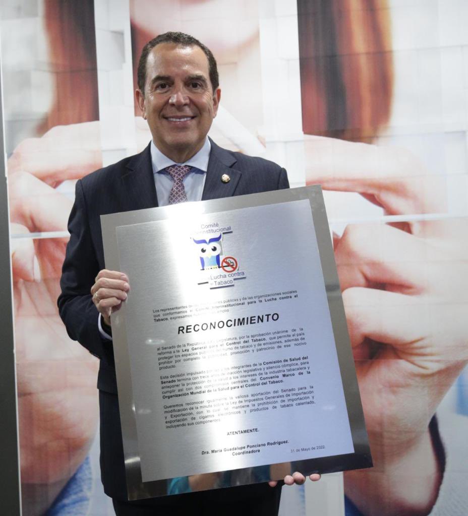 Ciudad de México.- A nombre del Senado de la República y la Comisión de Salud, el veracruzano Ernesto Pérez Astorga recibió este miércoles un reconocimiento del Comité Interinstitucional de Lucha contra el Tabaco, por su trabajo en las reformas a la Ley General de Control de Tabaco.