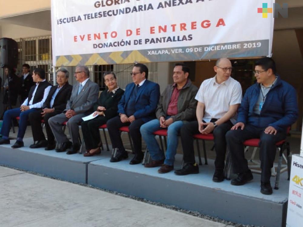 Xalapa, Ver.- En el marco de la entrega de siete pantallas a la telesecundaria anexa a la Benemérita Escuela Normal Veracruzana (BENV), la senadora Gloria Sánchez Hernández señaló que este tipo de herramientas educativas son fundamentales para la escuela y que les permitirá facilitar el aprendizaje de los alumnos.