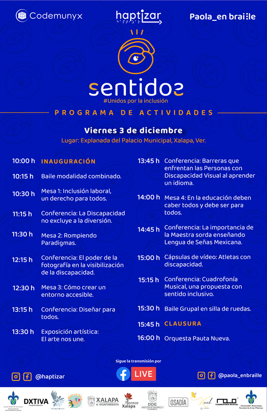 “Sentidos: Unidos por la Inclusión” se realiza para conmemorar el Día Internacional de las Personas con Discapacidad, y se podrá seguir por Facebook Live de @haptizar y Paola_enbraille.