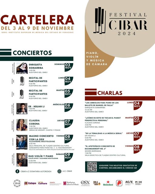 Xalapa, Ver.- Del 3 al 9 de noviembre, Xalapa será sede del séptimo Festival CIBAR 2024, que tiene como escenario el Instituto Superior de Música, y que gracias al trabajo y calidad de sus participantes se ha consolidado como un referente cultural tanto en México como en el extranjero.
