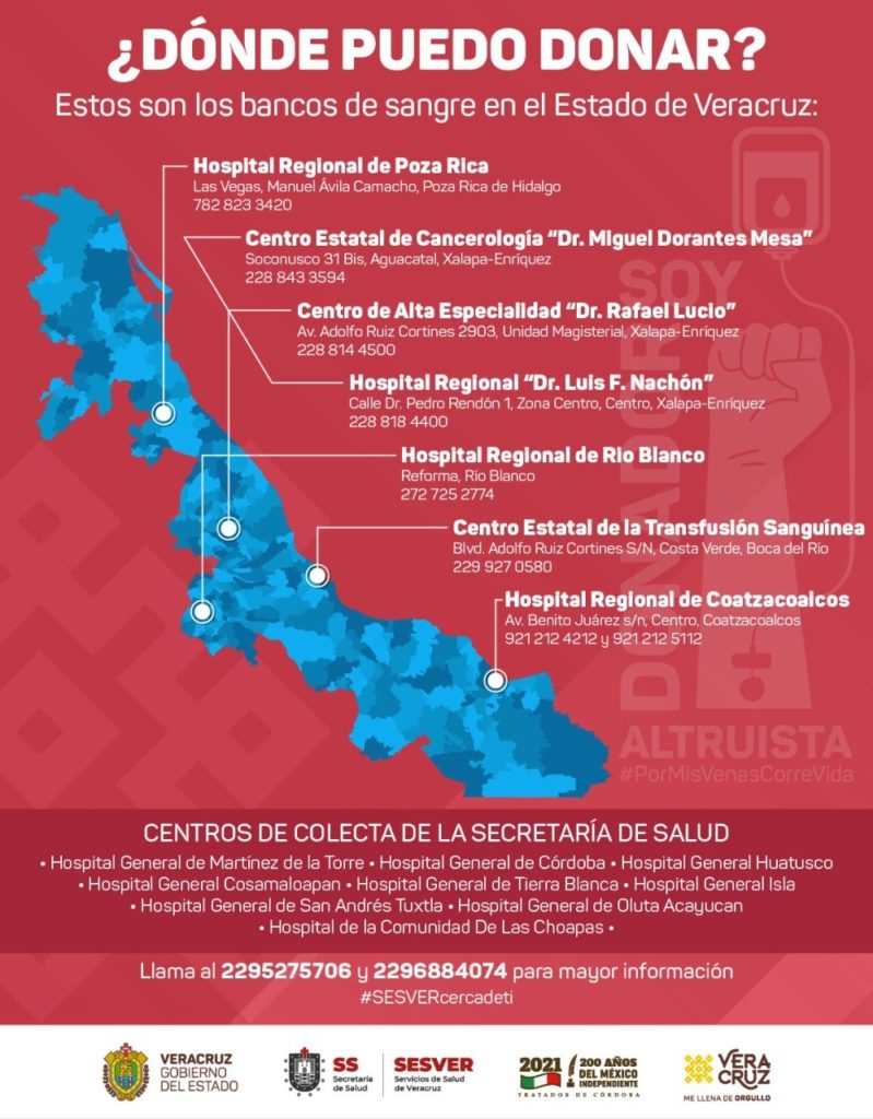 En los municipios de Xalapa, Coatzacoalcos, Río Blanco, Boca del Río, Poza Rica, Martínez de la Torre, Córdoba, Huatusco, Cosamaloapan, Tierra Blanca, Isla, San Andrés Tuxtla, Acayucan y Las Choapas, se encuentran los sitios para recibir a los donantes.