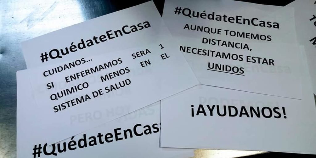 “Si enfermamos será un químico menos en el sistema de salud #QuédateEnCasa, aunque tomemos dist ancia, necesitamos estar unidos, ayúdanos #QuédateEnCasa”, piden en los papeles los químicos.