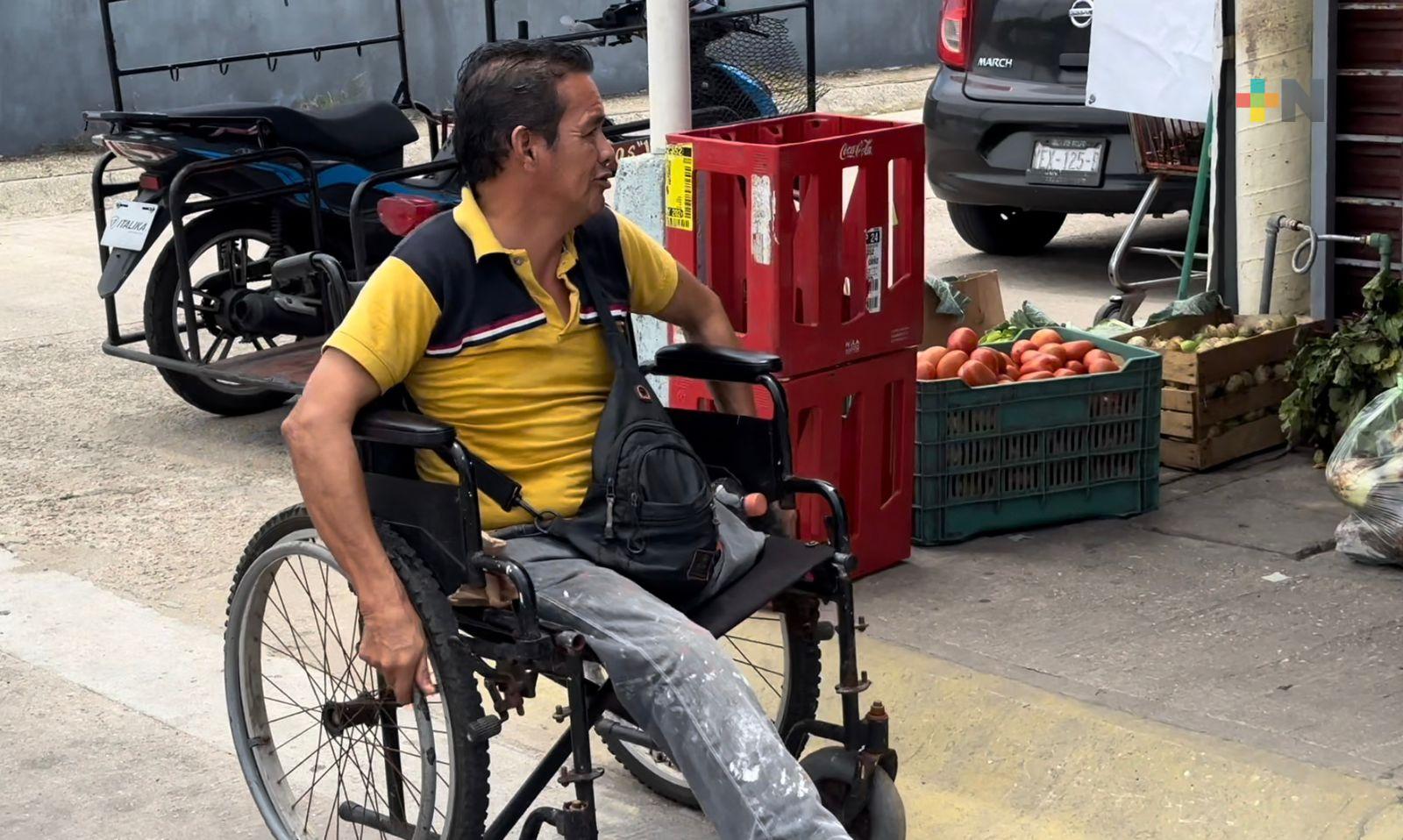Coatzacoalcos, Ver.- Iván Manzano lleva más de 20 años en silla de ruedas y se gana la vida entregando mandaditos en motocicleta.