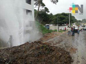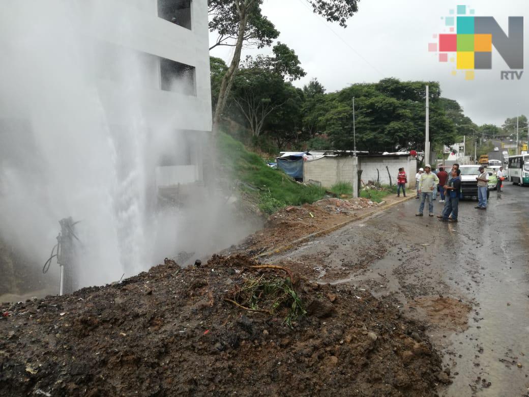 Xalapa, Ver.- La tarde de este martes, durante trabajos de excavación en una obra en la Avenida Culturas Veracruzanas, una retroexcavadora fracturó el colector pluvial y la tubería de suministro de agua potable de la Comisión Municipal de Agua y Saneamiento (CMAS).