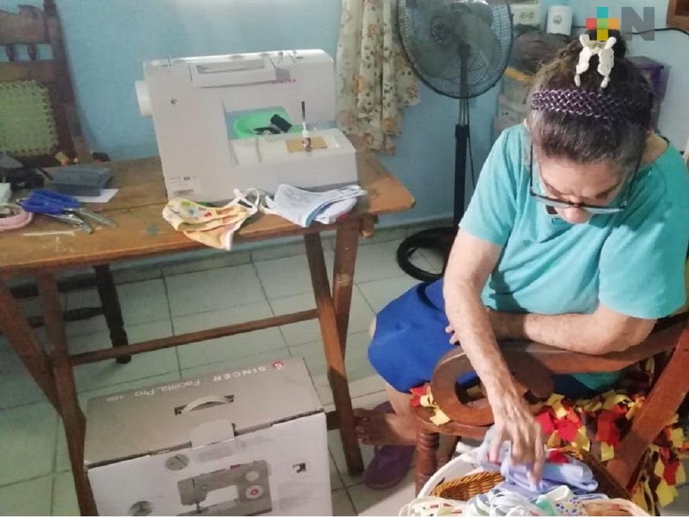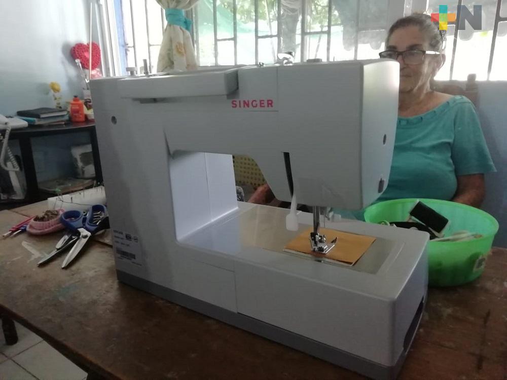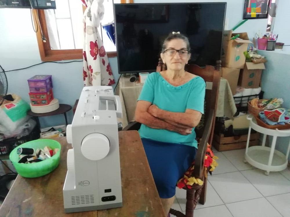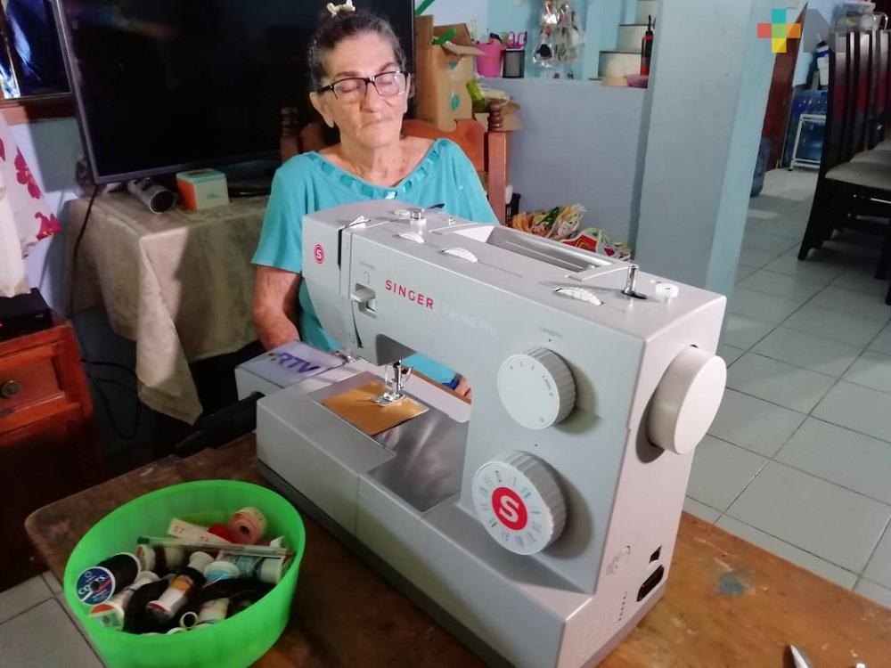 Coatzacoalcos, Ver.- Doña Dula Enríquez García. quien desde que comenzó la contingencia sanitaria elabora cubrebocas que regala a todas las personas, fue sorprendida con la donación de una máquina de coser de parte de la empresa Singer México para que continúe con su labor.