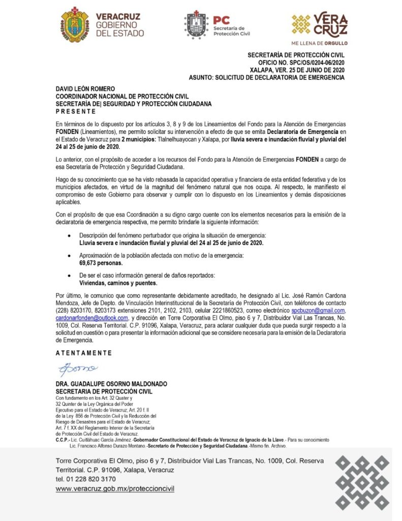 Xalapa, Ver.- La Secretaría de Protección Civil (SPC) en Veracruz remitió este jueves la solicitud de Declaratoria de Emergencia para los municipios de Tlalnelhuayocan y Xalapa a la Coordinación General de Protección Civil, y de esta manera acceder a recursos del Fondo Nacional de Desastres (Fonden).