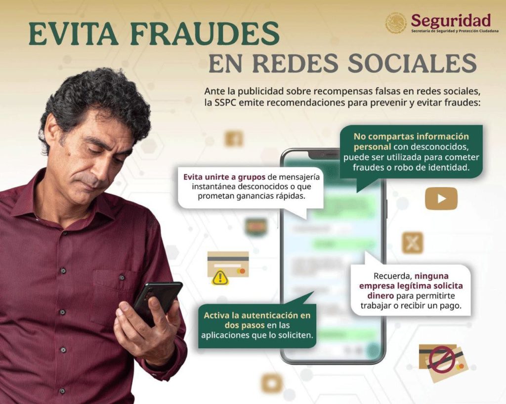 Ante la publicidad engañosa sobre recompensas falsas dirigidas a usuarios de aplicaciones de mensajería instantánea, la Secretaría de Seguridad y Protección Ciudadana (SSPC), a través de la Dirección General de Gestión de Servicios, Ciberseguridad y Desarrollo Tecnológico, emite recomendaciones para prevenir a los ciudadanos y evitar que sean víctimas de ciberestafas.