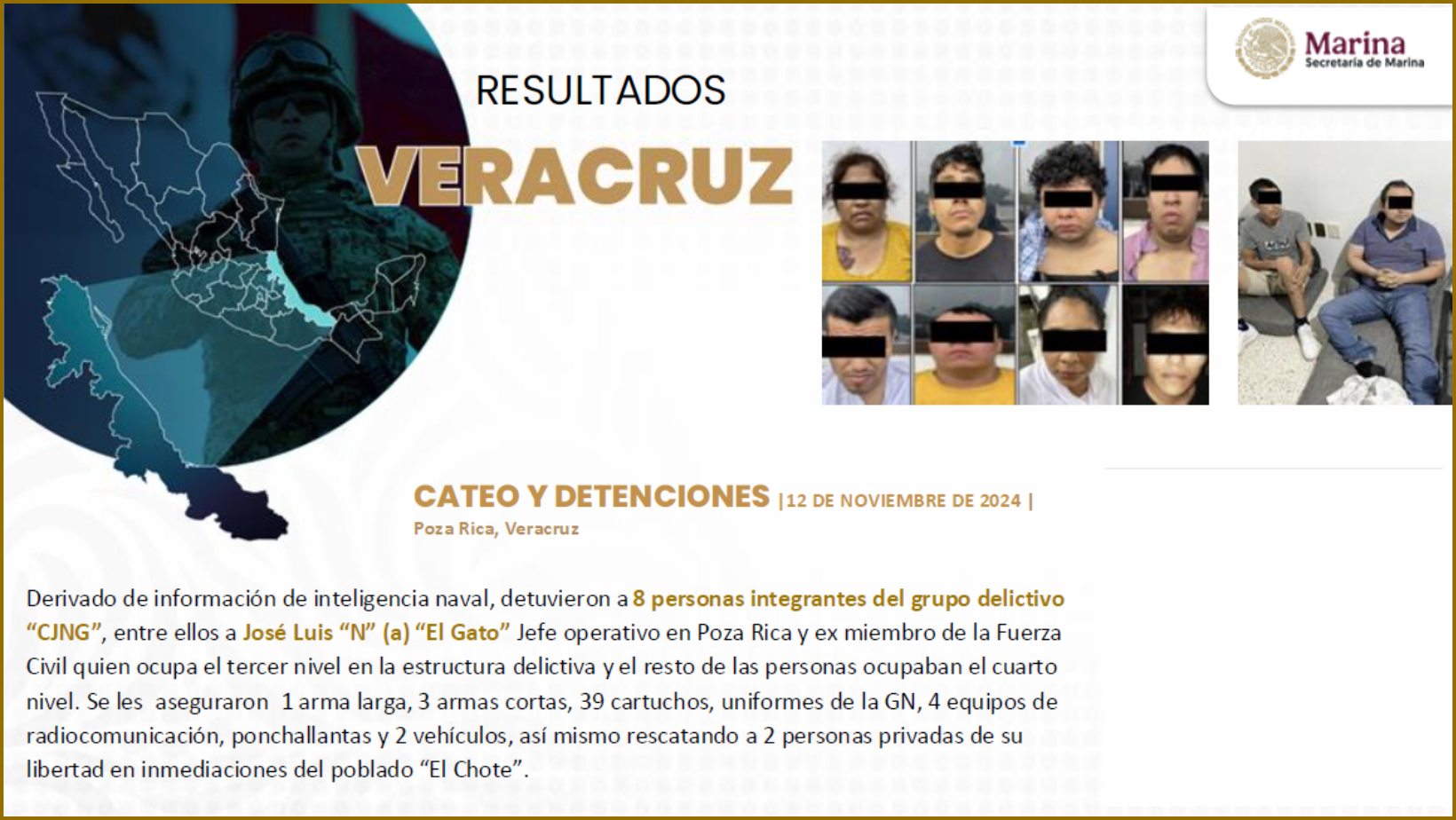 Además en Poza Rica fueron detenidos ocho integrantes de Cártel Jalisco Nueva Generación, donde se les aseguraron armas largas, cortas, cartuchos y vehículos.