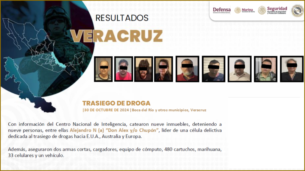 García Harfuch también reportó que en operaciones realizadas en diferentes municipios, con información del Centro Nacional de Inteligencia, se catearon nueve inmuebles donde fueron detenidas nueve personas.
