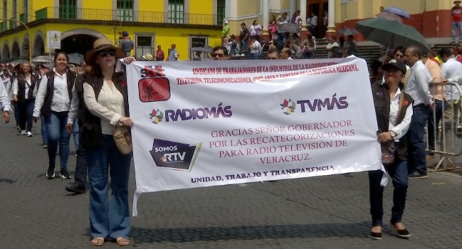 Xalapa, Ver.- En el marco del desfile conmemorativo al Día del Trabajo, personal de base afiliados al Sindicato de Trabajadores de la Industria de la Radio y la Televisión (STIRTT-CTM) adscritos a Radiotelevisión de Veracruz expresaron su agradecimiento al gobernador Cuitláhuac García Jiménez por facilitar la recategorización de 176 trabajadores.