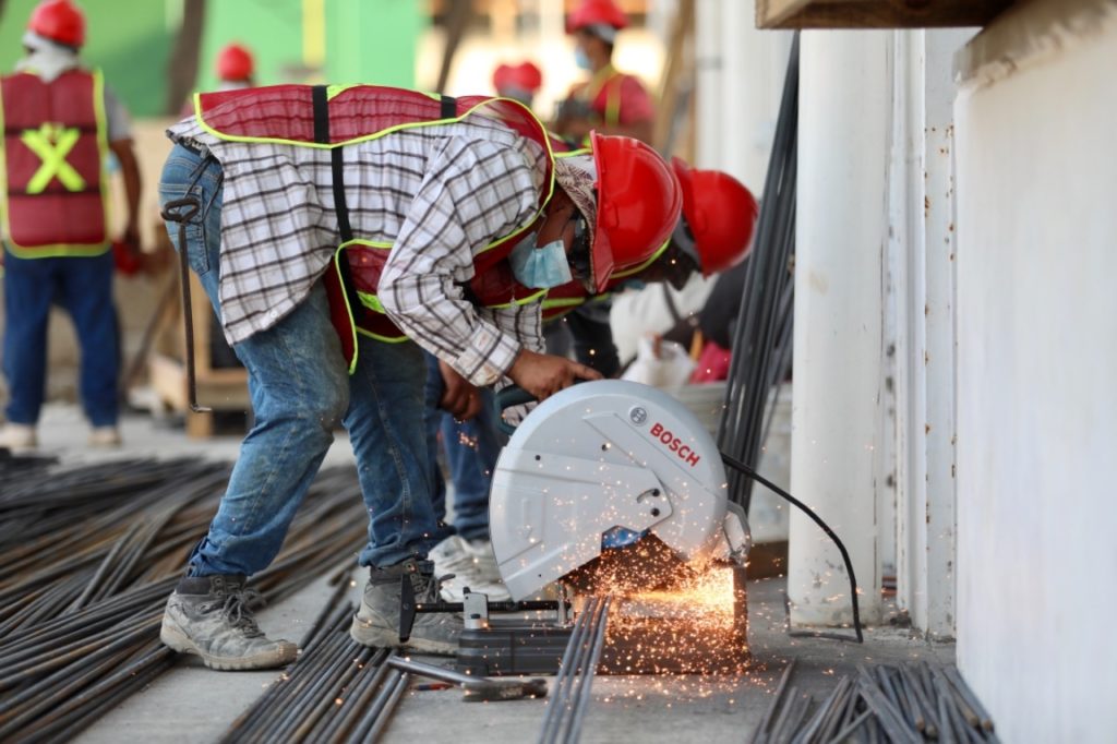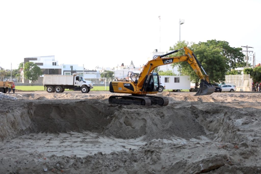 En las instalaciones de este complejo deportivo, el Mandatario analizó los planos junto con la arquitecta encargada de la obra, Astrid González Córdoba; observaron las maniobras que se realizan en el área de cimentación para la cancha y el equipo que será colocado para dicha infraestructura deportiva.