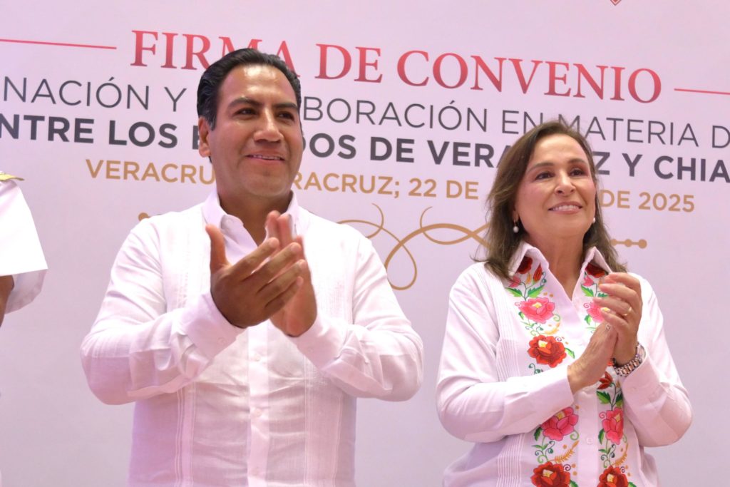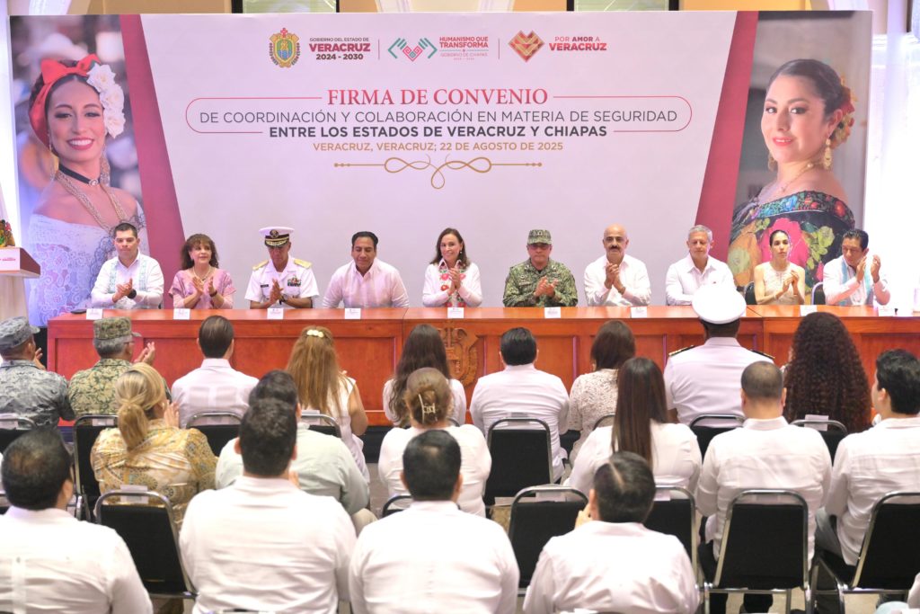 Veracruz, Ver.- La gobernadora Rocío Nahle García y su homólogo de Chiapas, Eduardo Ramírez Aguilar, signaron el Convenio de Coordinación y Colaboración en materia de Seguridad, con el propósito de reforzar las estrategias interestatales de prevención, vigilancia y atención ciudadana en beneficio de ambas entidades.