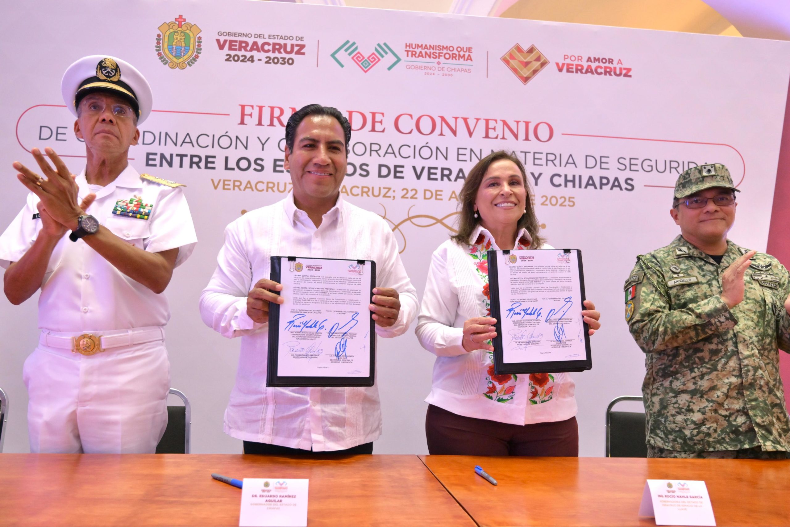 Veracruz, Ver.- La gobernadora Rocío Nahle García y su homólogo de Chiapas, Eduardo Ramírez Aguilar, signaron el Convenio de Coordinación y Colaboración en materia de Seguridad, con el propósito de reforzar las estrategias interestatales de prevención, vigilancia y atención ciudadana en beneficio de ambas entidades.