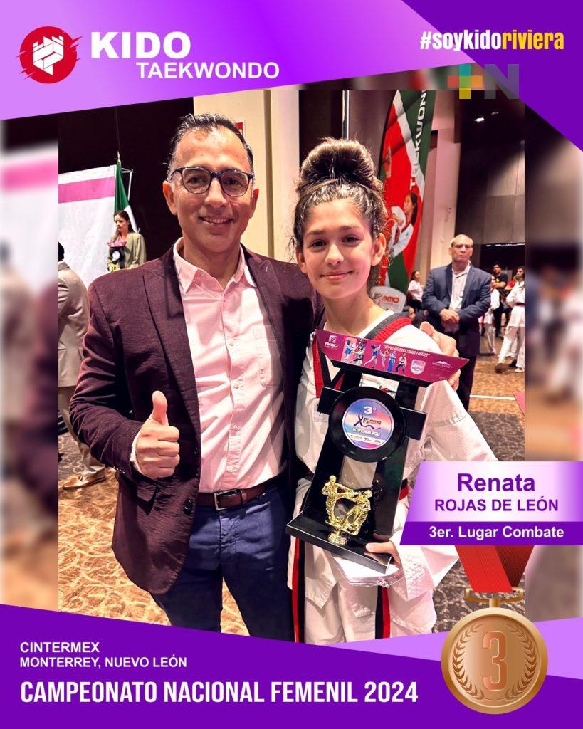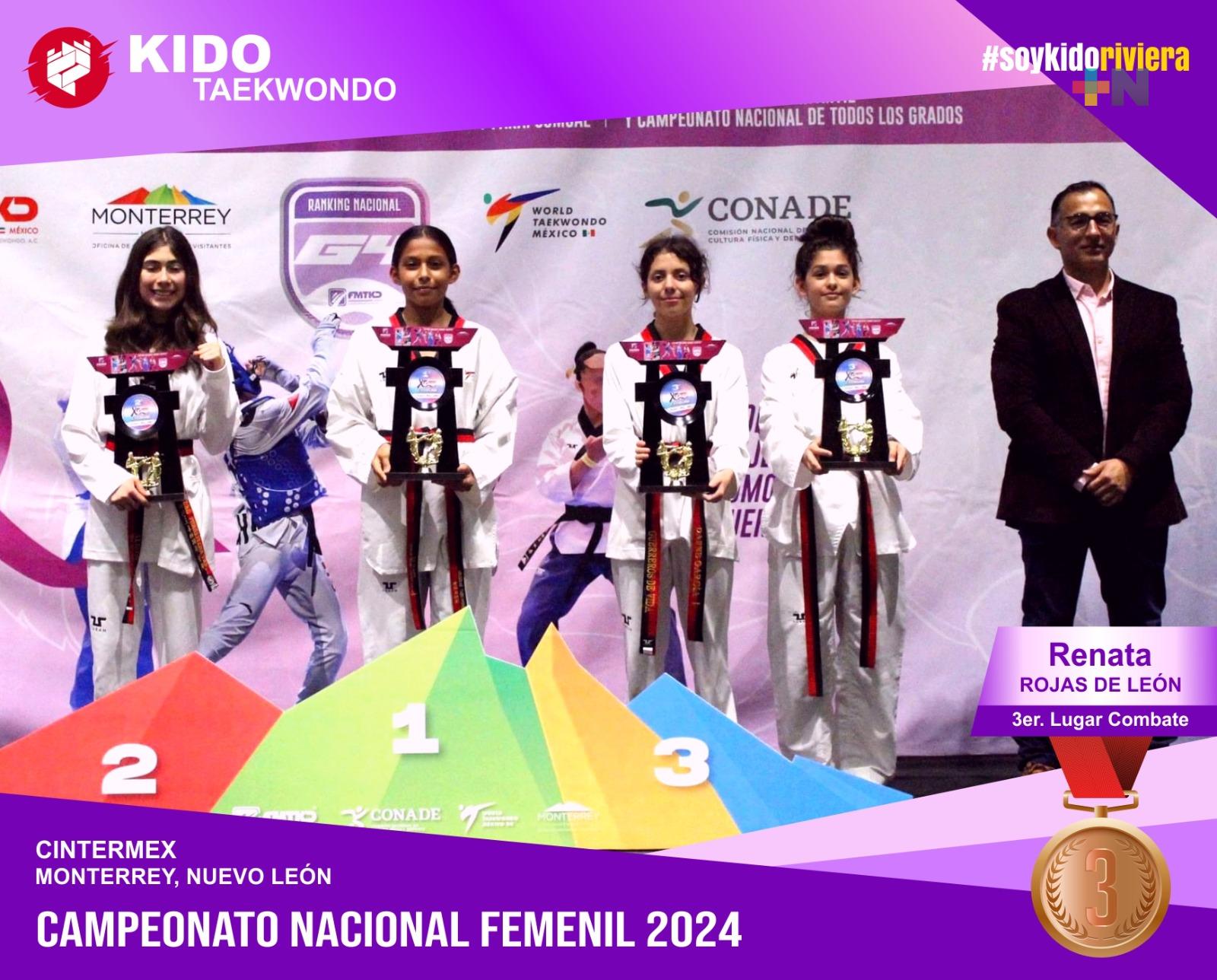 “Renata Rojas de León conquistó metal de bronce, ubicándose dentro de las mejores del país, destacando en este evento ranking G4 nacional, convocado por la Federación Mexicana de Taekwondo”, comentó el director general de KIDO Taekwondo, profesor Yaseff Zamor Alvarado.