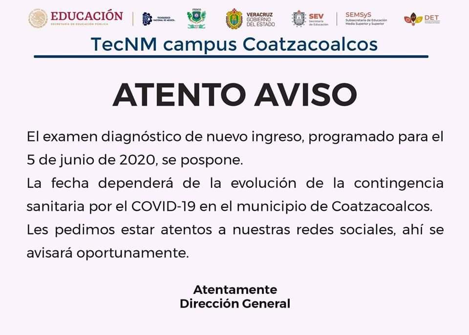 Coatzacoalcos, Ver.- El Tecnológico Nacional de México (TecNM) campus Coatzacoalcos anunció que fue pospuesta la fecha para el examen de ingreso a la institución.