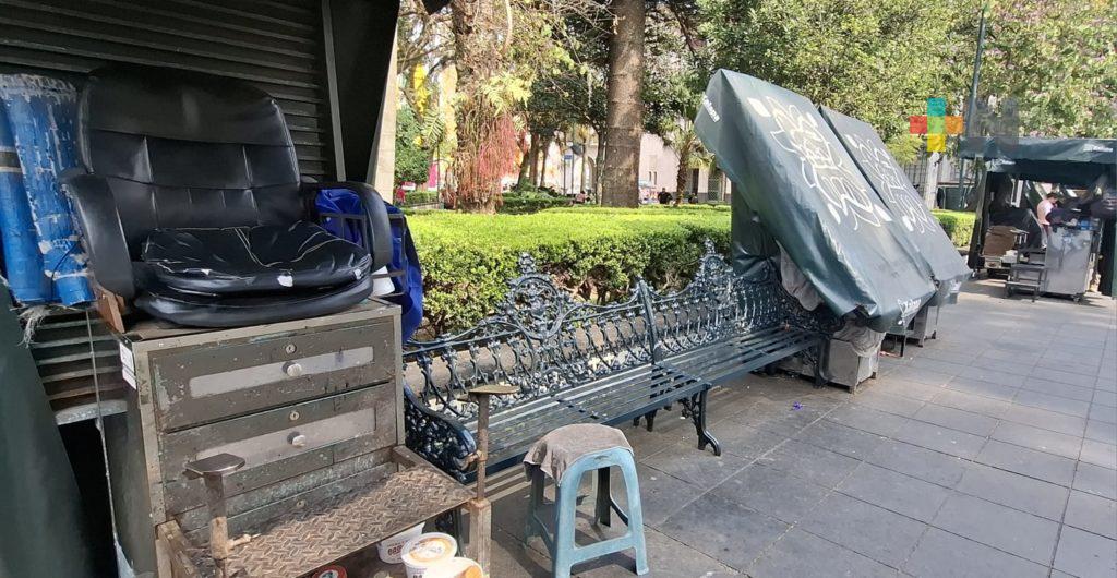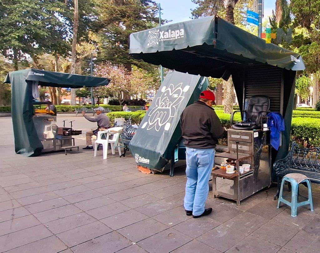 En el Parque Juárez de Xalapa, algunas carpas de los betuneros de plano están cerradas y la mayoría lucen desocupadas, con las tintas, cepillos y cajones en desuso.