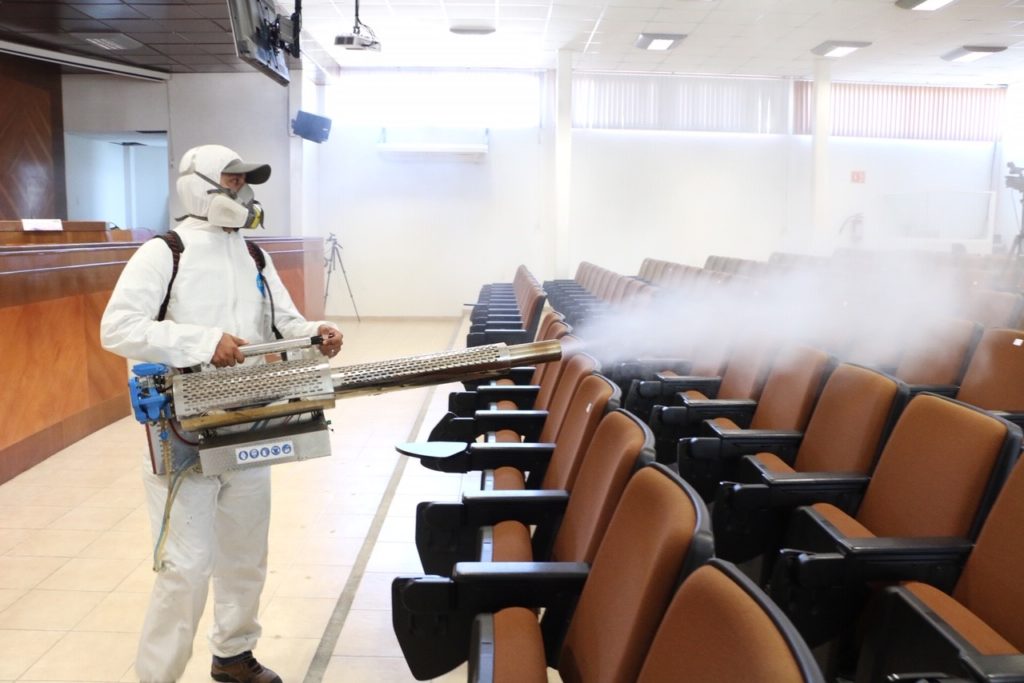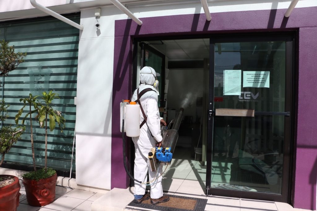 Xalapa, Ver.- Por cuarta ocasión se llevó a cabo la sanitización de los espacios del Tribunal Electoral de Veracruz (TEV), con el objetivo de disminuir el riesgo de contagio de la propagación del COVID-19.