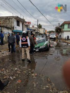 En la Calle Zuluaga de la colonia Revolución un vehículo de alquiler resultó varado por inundación y en el Boulevard Xalapa–Coatepec se registró un accidente.