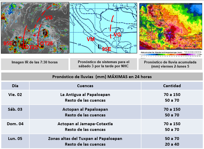 Xalapa, Ver.-La amplia vaguada establecida en el Golfo de México, se conecta con las ondas tropicales 25 y 26, las cuales se mueven lentamente por el centro y sureste del país, respectivamente, ayudando a una mayor inestabilidad en estas regiones del país al apoyarse con el viento divergente de una vaguada en altura, situación que daría lugar a las siguientes condiciones meteorológicas en el estado de Veracruz entre este viernes 2 y el lunes 5: