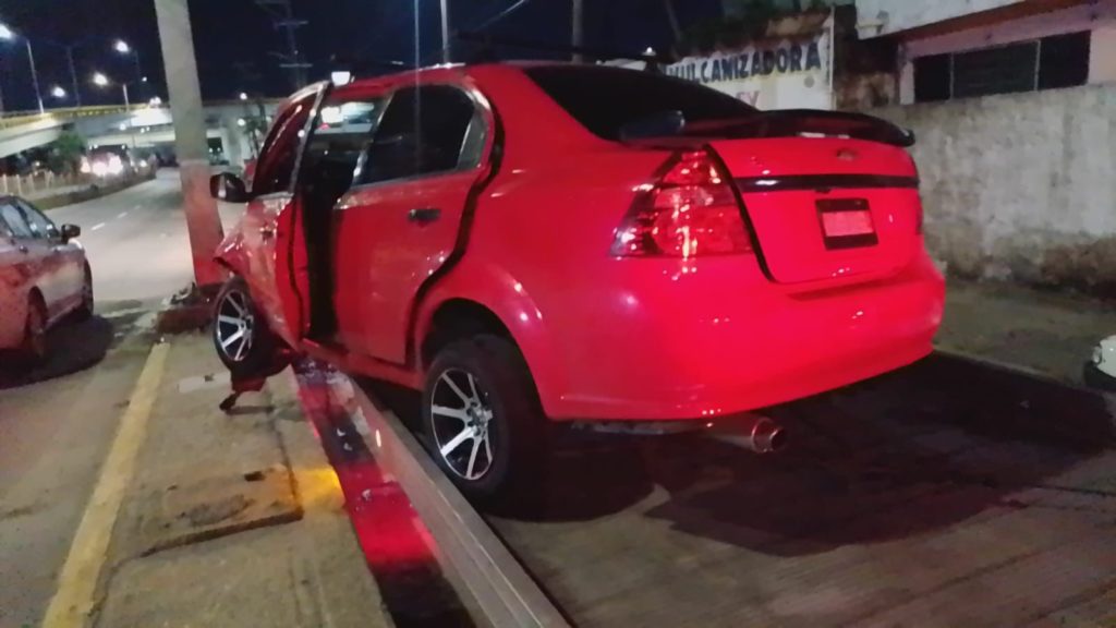 Cuando transitaba de sur a norte con dirección al centro, perdió el control del automóvil Aveo color rojo que conducía y chocó contra la base de la señalética, quedando destrozado el vehículo frente a la Universidad del Golfo de México (UGM).