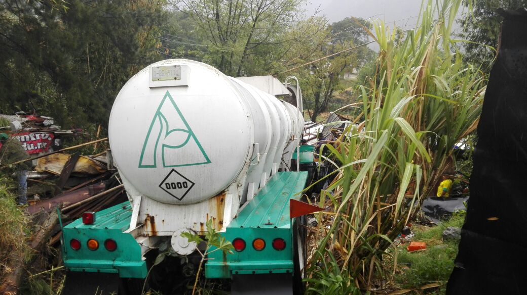 Córdoba, Ver., 08 de marzo de 2017.- El exceso de velocidad provocó que un tracto camión acoplado a carro tanque, con sustancias no peligrosas, volcara sobre unas viviendas en la autopista Córdoba – Puebla, en el tramo Nogales – Ciudad Mendoza, a la altura del kilómetro 262 + 300.
