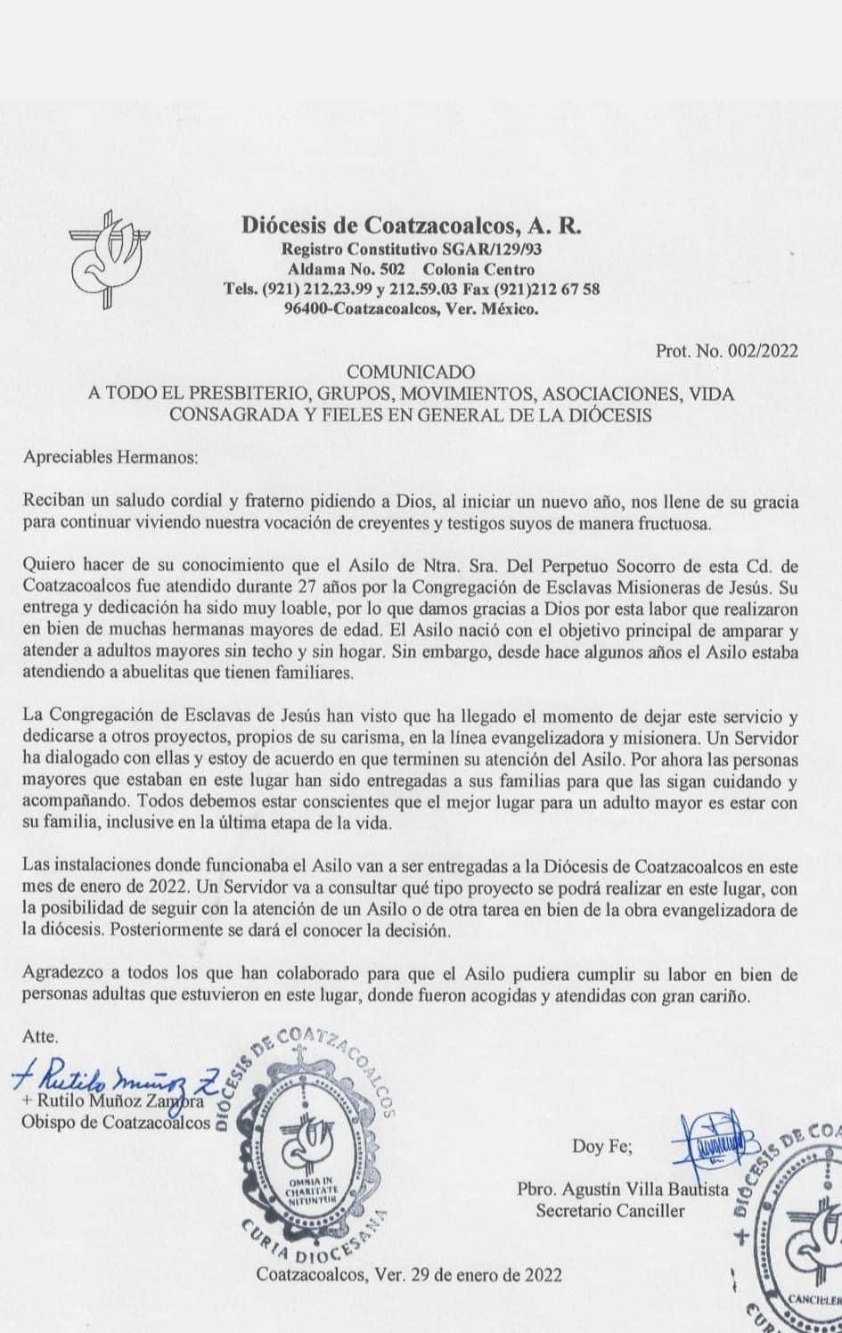 Lo anterior lo dio a conocer la Diócesis de Coatzacoalcos en un comunicado firmado por el obispo Rutilo Muñoz Zamora, quien aclaró que las abuelitas ahí atendidas fueron entregadas a sus familiares.
