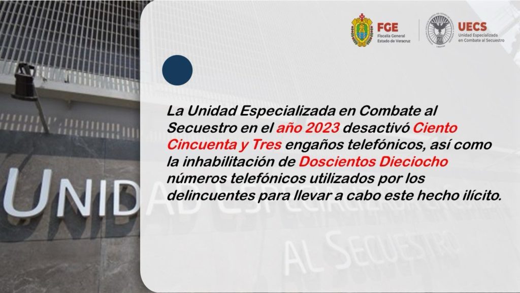 Xalapa, Ver.- La Fiscalía general del Estado, encabezada por Verónica Hernández Giadáns,  través de la Unidad Especializada en Combate al Secuestro informa a la sociedad que, durante el año 2023 realizó la desactivación de 153 engaños telefónicos, así como la inhabilitación de 218 números telefónicos relacionados con este delito.